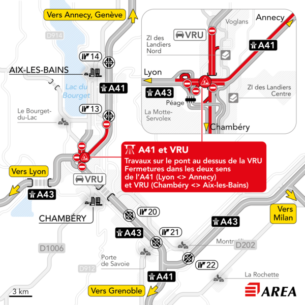 • Cette opération d’envergure, confiée par AREA à Bouygues Travaux Publics Régions France, nécessitera la fermeture de l’A41 Nord et de la VRU au niveau de la zone de travaux :